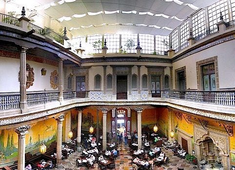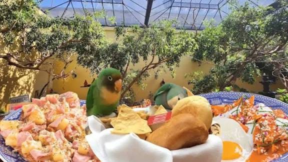 Hay también otra sucursal, "la de los pajaritos", dónde comes bajo un techo de cristal mientras decenas de aves vuelan sobre tu cabeza y tu plato de enchiladas suizas. ¿Si les comenté que la enchiladas suizas fueron creadas en Sanborns?
